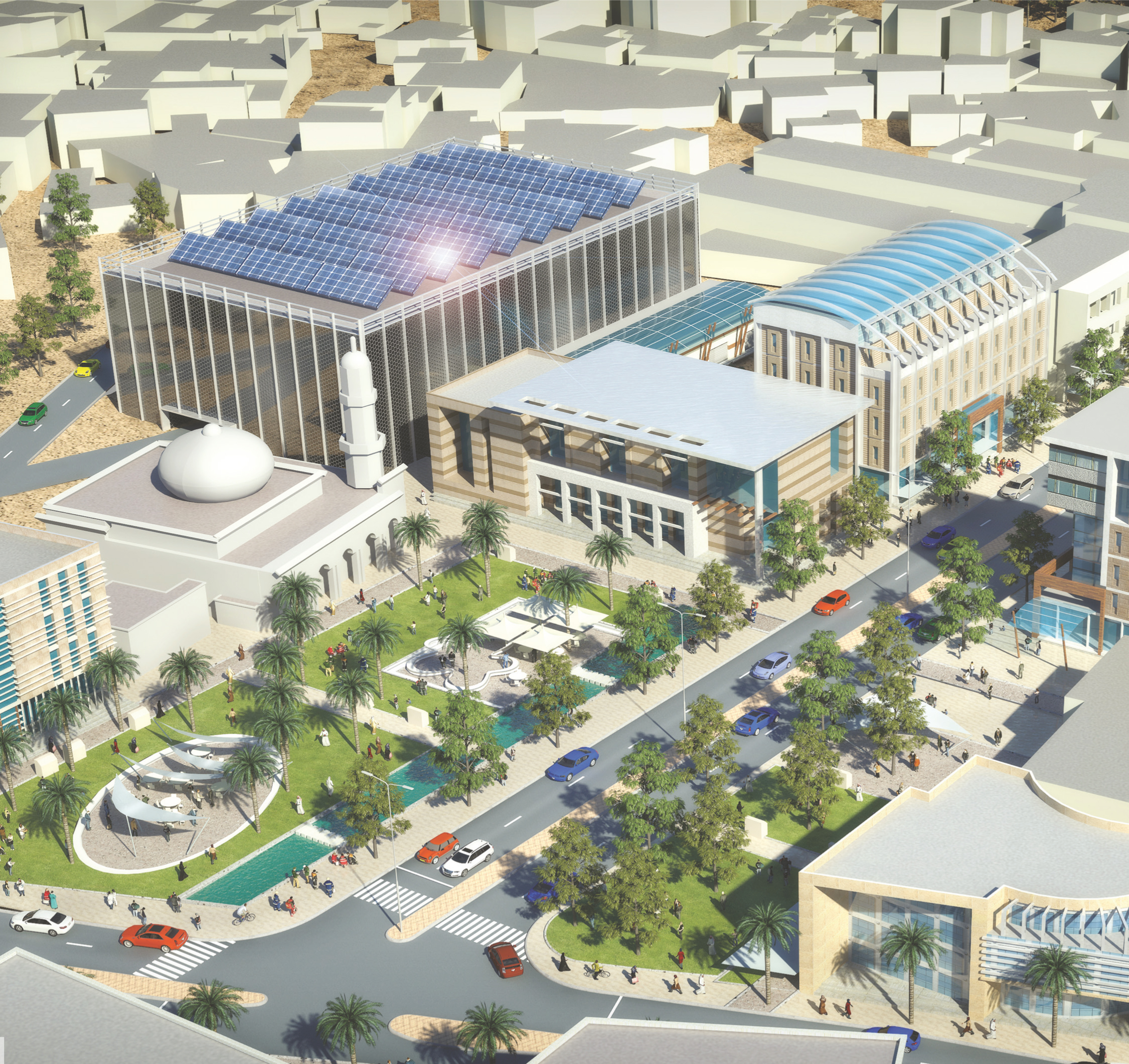 ومن المقترح زراعة شريط أخضر بين منطقة المباني وبين الجبال مما يجعل المدينة محفوفة بإطار أخضر من الأشجار مع إمكانية استغلال الطاقة الشمسية لتزويد المنطقة بالطاقة اللازمة لضخ المياه.