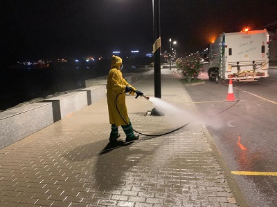 المستجد (كوفيد 19)، فقد واصلت البلدية ممثلة في المديرية العامة للشؤون الصحية تنفيذ خطة الرش والتطهير في المواقع العامة بولايات المحافظة.حيث جاءت الحملة في إطار إجراءات بلدية مسقط الاحترازية والوقائية للحد من انتشار فيروس كورونا المستجد "كوفيد 19"، والتي تنفذها خلال هذه الفترة بالتعاون مع وزارة البلديات الإقليمية وموارد المياه وبلدية ظفار وبلدية صحار، و اشتملت أعمال تطهير المرافق على التركيز على الطرق الداخلية والمرافق العامة ومظلات الانتظار ومواقف سيارات الأجرة وأمام المحلات التجارية والمواقع الحيوية الأخرى بمختلف ولايات ومحافظات السلطنة، كما تم تشكيل فرق عمل مختصة في أعمال الرش والتعقيم آخذًة بالإجراءات الاحترازية عند القيام بأعمال الرش ، كما تم الاعتماد في خطة الرش على اختيار المعقمات الآمنة والمختبرة قياسيًا، وتم توزيع فرق الرش والتعقيم على كافة المناطق، وذلك حسب جدول زمني معد لكافة الولايات، بدءً من الساعة السابعة مساءاً وبشكل متواصل حتى الساعة السابعة صباحاً من كل يوم .