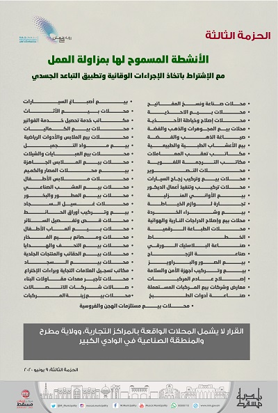 في إطار التنسيق المشترك مع اللجنة العليا المكلفة بمتابعة التطورات الناتجة عن انتشار كوفيد19، ومراجعة قرار مزاولة بعض الأنشطة لأعمالها وفق ما يضمن تطبيق الإجراءات الوقائية عند تقديم الخدمة، واتخاذ كافة الاشتراطات الصحية المتعلقة بسلامة العاملين والمتعاملين مع مقدمي الخدمات، فقط أعلنت بلدية مسقط عن قائمة الحزمة الثالثة من الأنشطة والتي تضمنت عدد (49) نشاطًا سُمح لها بمزاولة الاعمال شريطة الالتزام بالإجراءات الإحترازية والضوابط والاشتراطات المحددة بالتنسيق مع وزارة الصحة.