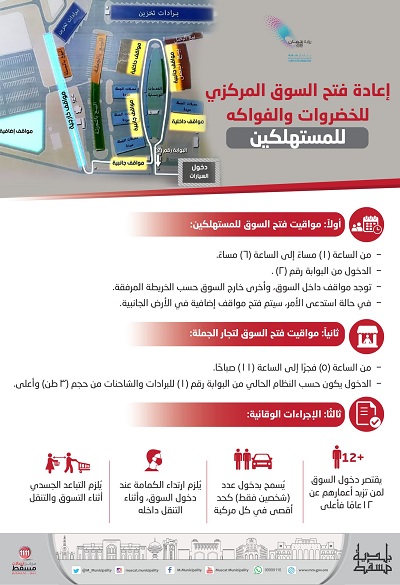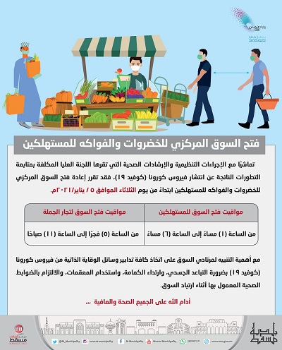 قررت بلدية مسقط إعادة فتح السوق المركزي للخضروات والفواكه للمستهلكين ابتداءا من يوم الثلاثاء الموافق 5 يناير 2021م، وفق مواقيت موضحة، مع اتخاذ كافة وسائل الوقاية الذاتية، والإجراءات الإحترازية اللازمة.