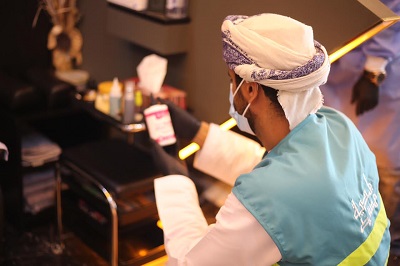 • الالتزام بتنظيف وتعقيم مقابض الأبواب وطاولات الخدمة وجهاز التحكم بالتلفزيون بالمعقمات التي تحتوي على نسبة 70% كحول.