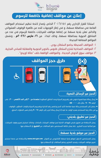 في إطار التوجهات للحد من ظاهرة الوقوف العشوائي والدائم ، واستنادًا للقرار الإداري رقم 151/2016 الخاص بإصدار لائحة تنظيم استخدام المواقف العامة في محافظة مسقط تبدأ بلدية مسقط تفعيل مواقف إضافية للمركبات خاضعة للرسوم في عدد من المناطق الحيوية بمحافظة مسقط، وذلك ابتداءً من 6 / مارس/2022م ، وتشمل المواقع المضافة : المواقف المحيطة بجامع السلطان بروي، المواقف المحاذية لشارع السلطان قابوس بالخوير الجنوبية والمقابلة للمباني التجارية، مواقف سوق الخوض الجديدة ، والمواقف الواقعة خلف "صالة اوريدو".
