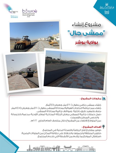 تكثف بلدية مسقط جهودها من أجل تطوير البرامج والمشاريع الخدمية التي تجعل من مسقط مدينة مستدامة تلبي احتياجات أفراد المجتمع، وانسجامًا مع هذه الجهود تنفذ البلدية مشروع "ممشى حي البيضاء " بمنطقة جال في ولاية بوشر؛ الذي يعد أحد المشاريع المجتمعية الهادفة لاستغلال المساحات ، وتوفير مرافق ذات جودة تعزز من الأنشطة الصحية للأفراد.