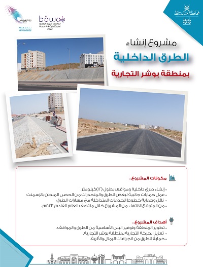 في إطار سعي بلدية مسقط لتطوير قطاع الطرق وتنفيذ مشاريع البنية الأساسية والمشاريع الخدمية التي تواكب مرتكزات التنمية بمحافظة مسقط، فقد نفذت البلدية ممثلة في المديرية العامة للمشاريع مشروعًا لإنشاء الطرق الداخلية بمنطقة بوشر التجارية، والذي يأتي كأحد مشاريع البلدية لتعزيز منظومة الطرق بما ينظر إلى نماء الحركة العمرانية من جهة، ولنشاط المناطق التجارية من جهة أخرى، وانعكاسات هذه العوامل على الحركة المرورية.