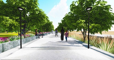 يتضمن المشروع: إنشاء ممشى ومسارًا للدراجات الهوائية بطول (1972) مترًا، استراحات، محال، مطاعم، أجهزة للرياضة البدنية وألعاب الأطفال، ومرافق خدمية