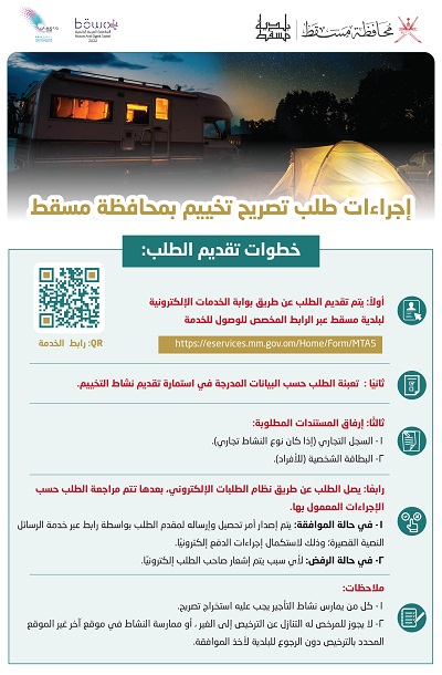 استنادًا إلى التعميم الصادر قبل وقت سابق من بلدية مسقط بشأن ضوابط واشتراطات التخييم في محافظة مسقط ونظرًا للاقبال على طلب استخراج التصريح مع الأجواء الباردة التي تشهدها المحافظة في هذا الوقت من السنة، فقد أوجدت البلدية منفذًا الكترونيًا لطلب خدمة استخراج تصريح تخييم بمحافظة مسقط وفق الضوابط والاشتراطات المعلن عنها سابقًا، مع وضع خريطة تفاعلية تتيح للراغبين في طلب الخدمة إمكانية اختيار الموقع الجغرافي للتخييم، وتسهل للبلدية مراقبة المواقع ومعرفة التصاريح وفقًا لتوزيعها جغرافيًا.
